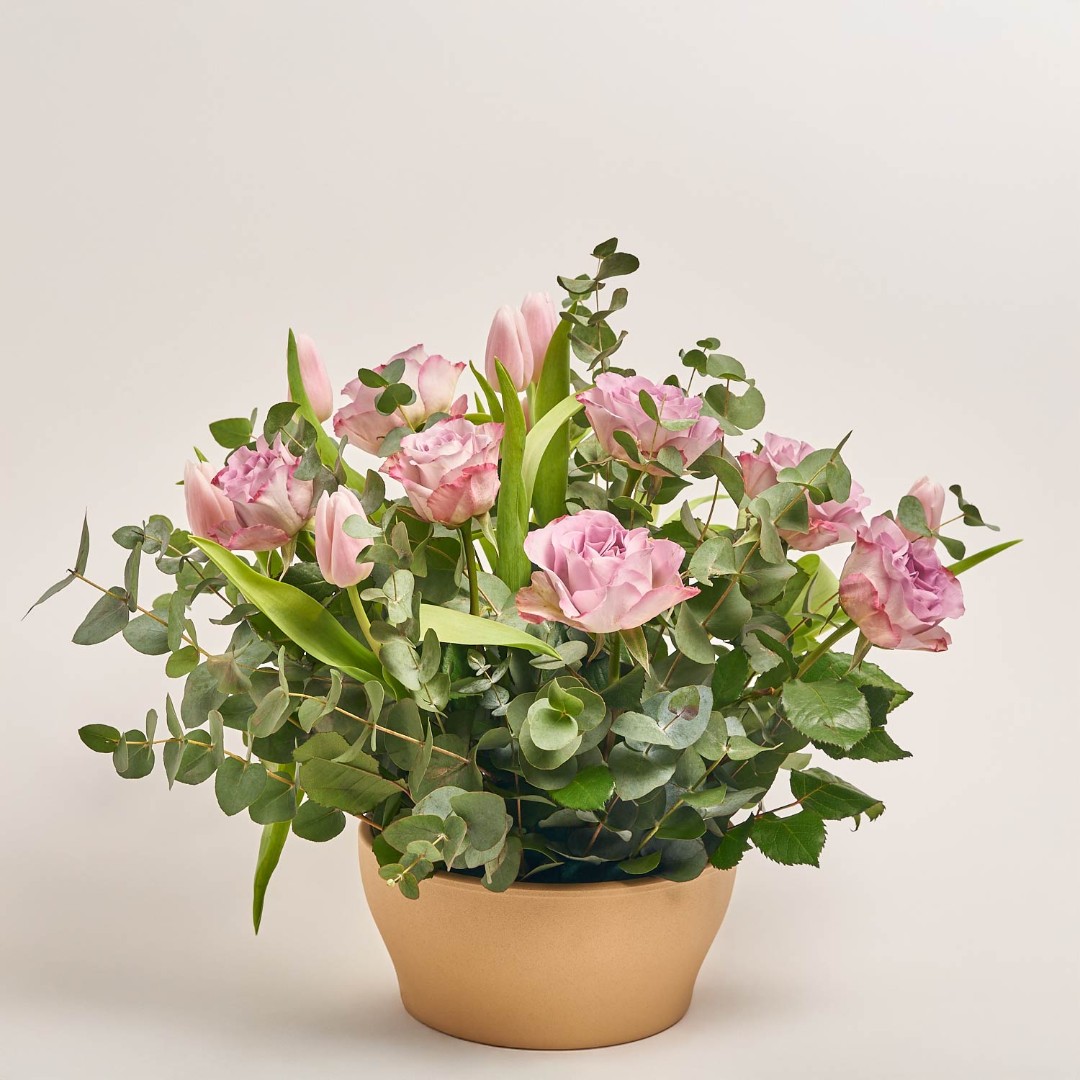 Склад: Троянда Мемори Лейн (7шт.), Тюльпан (8шт.) евкаліпт