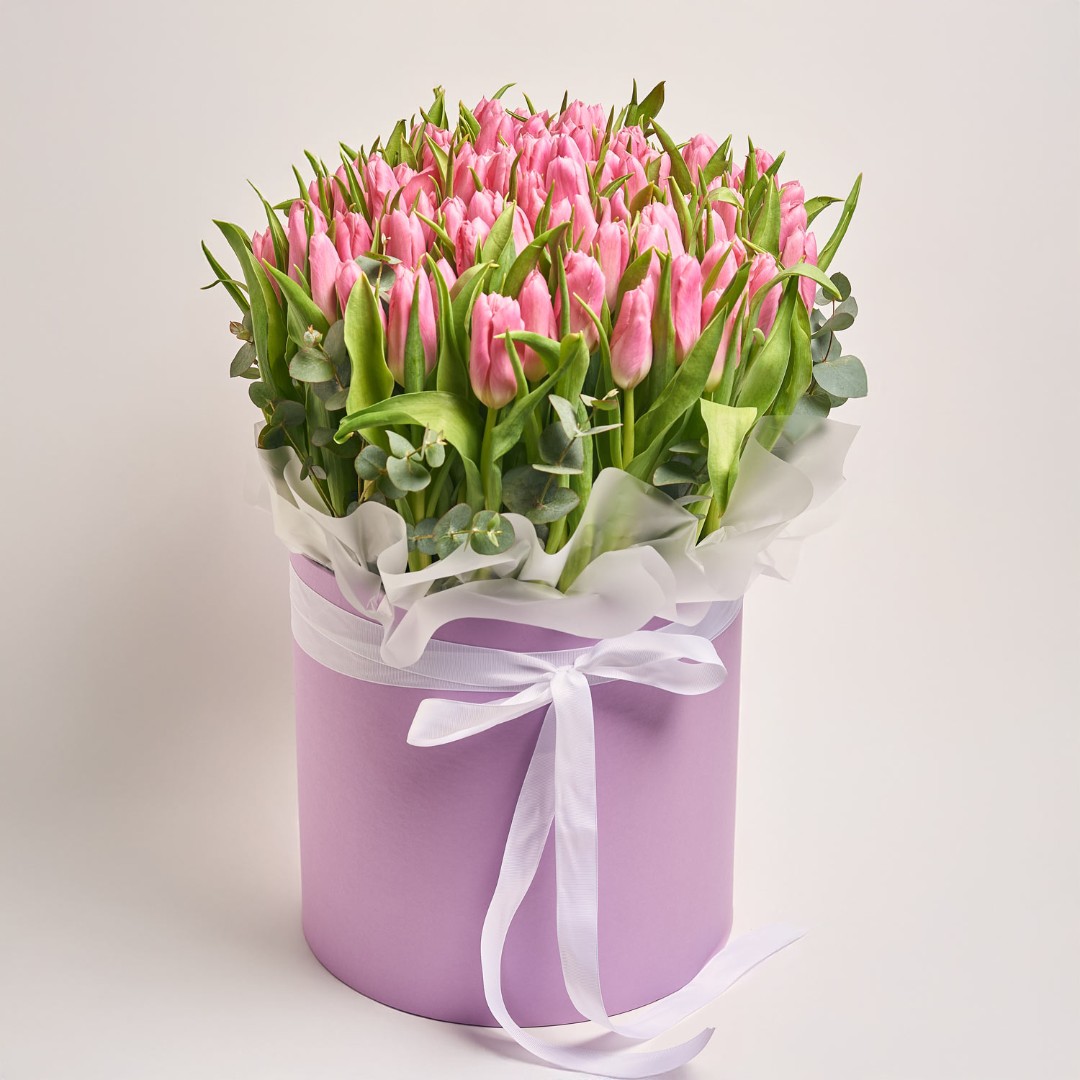 Склад: Тюльпан (101 шт.), евкаліпт Коробка 30 см.* 30 см.