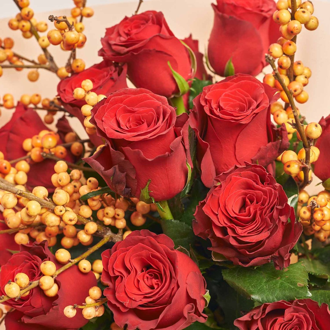 Склад: Троянда червона (15 шт.), Ілекс (6 шт.).