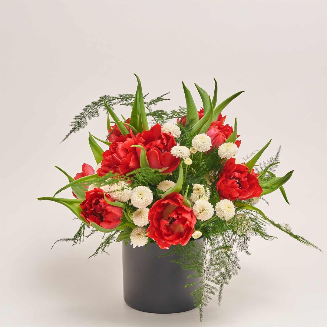 Состав: Хризантема (4шт.), Тюльпан (13шт.) Аспарагус, кашпо керамическое d12
