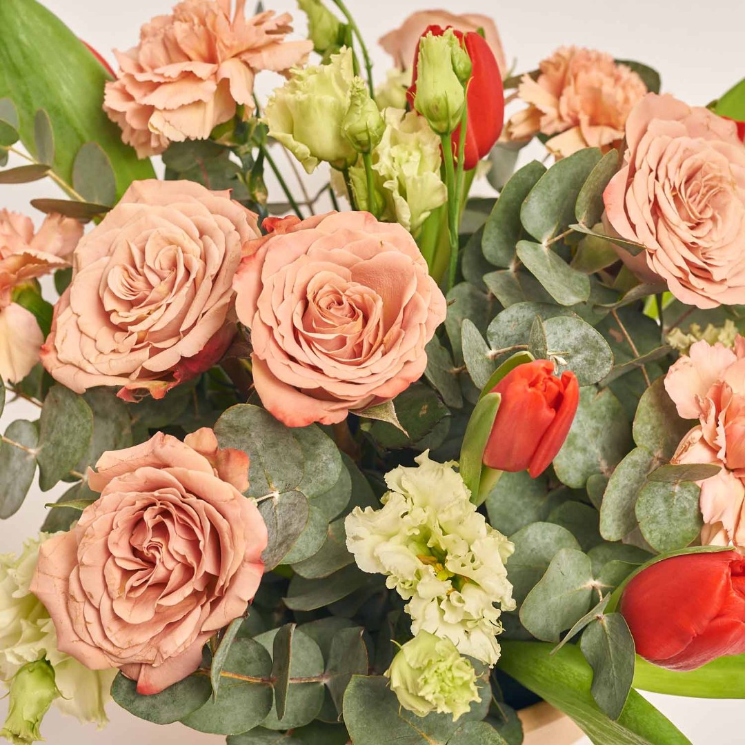 Состав: Тюльпан (6шт.,), Гвоздика (4шт.,). Роза Капучино (7 шт.,), Эустома (1шт.) Эвкалипт, кашпо керамическое d20